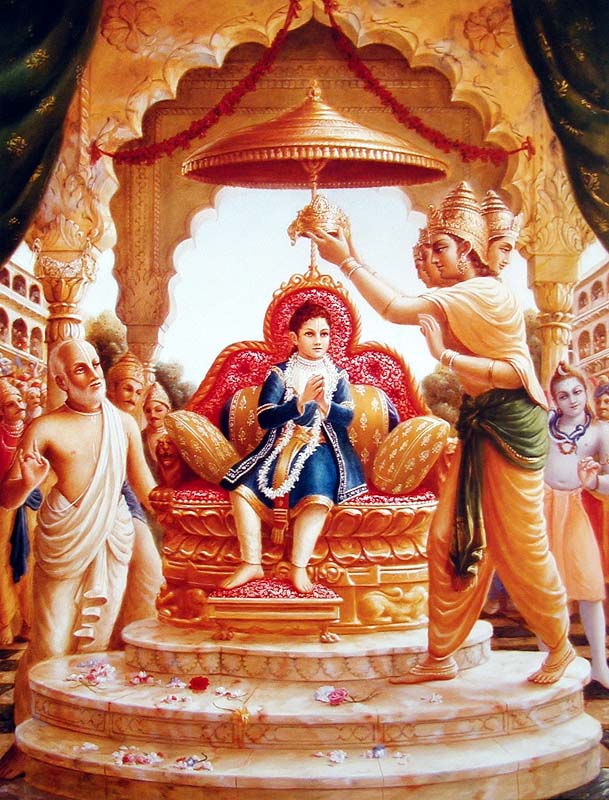 Верховный Господь остался очень доволен чистой преданностью Махараджи Прахлады и все же дал ему одно материальное благословение: Он сказал, что Прахлада обретет полное счастье уже в этой жизни, а после нее отправится на Вайкунтху. По благословению, которое дал Господь, Махараджа Прахлада должен был править материальным миром до окончания манвантары и иметь при этом возможность заниматься чистой бхакти-йогой — слушать о славе Господа, полностью зависеть от Него и служить Ему. Одна из обязанностей царя — совершать жертвоприношения, и Господь посоветовал Прахладе совершать жертвоприношения, занимаясь бхакти-йогой .