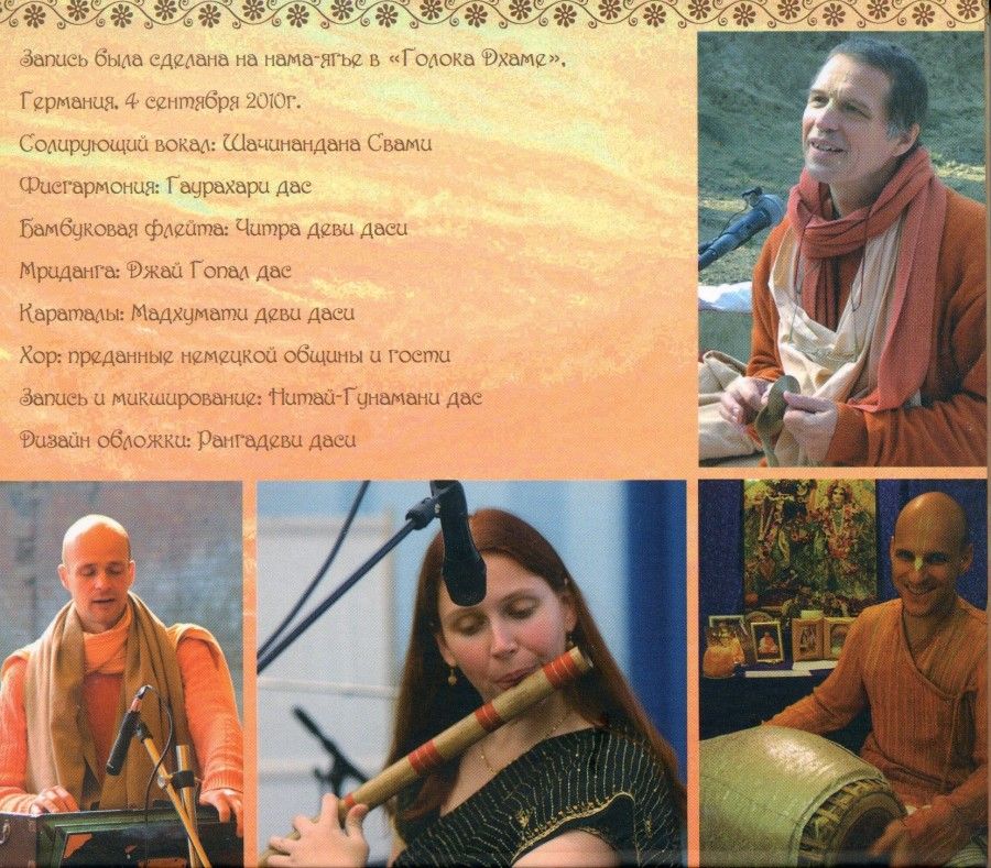 Киртаны на этих дисках исполнены с глубокой, искренней тоской по Богу. Мы записали их после Джанмаштами, празднования явления Кришны в этот мир. В тот день священнослужители украсили алтарь как лодку, и, когда алтарные занавеси распахнулись, все, кто был в храме, почувствовали, как Радха и Кришна плывут по реке любви прямо в их сердца. На волнах вдохновения мы пели всю ночь. Нам был нужен только Кришна, и ничего другого. Ничто в этом огромном мире не может сравниться со сладостью Верховного Господа, и мы, ощущая разлуку с Богом, выразили свои чувства в киртанах, записанных на дисках, которые вы сейчас держите в руках. Пусть они подарят вам вдохновение и блаженство, которое наполнило нас в тот вечер, когда произошло чудо нашей встречи с Господом.