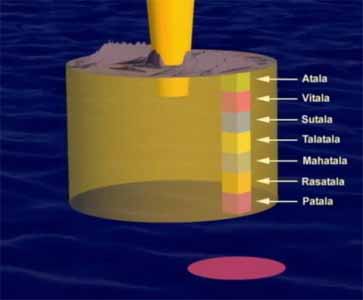 6. Витала (Бездна всех бездн) – место, где Шива, олицетворение разрушительных стихий, и его супруга Дурга в образе Бхавани, богини плодородия, занимаются любовными играми и от их соития проистекает река жизни, называемая Хатаки. Агни, бог огня, разъяренный Ваю, богом ветра, пьет воду из этой реки, шипит и плюется, в результате чего возникает золото хатака.