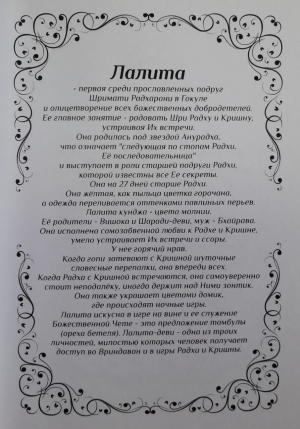 В книге приведено описание из авторитетных источников о каждой из Гопи (цвета их одежд, качества, таланты, служение каждой Гопи Божественной Чете и многое другое)!