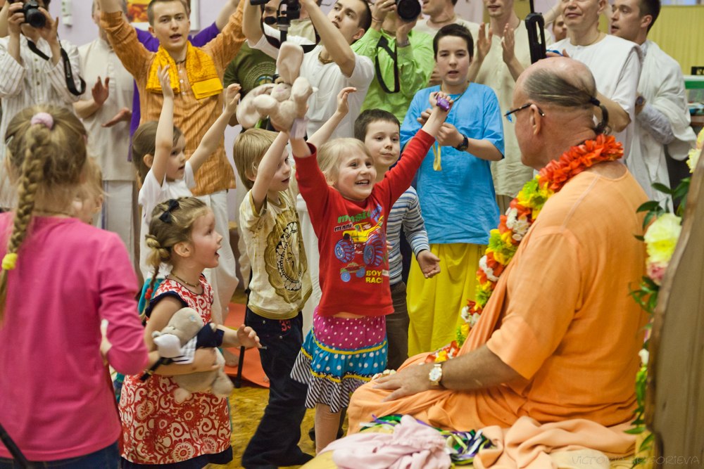 Конечно, успеха в сознании Кришны достичь далеко не так просто, как в спортивных состязаниях, и нашим детям нужно вдохновение с самого начала их практики сознания Кришны. Поэтому, когда бы ко мне не подошёл маленький преданный, я стараюсь встать на колено и уделить ему десять минут. Я знаю, что благодаря этому может начаться его долгий путь к Кришне. |