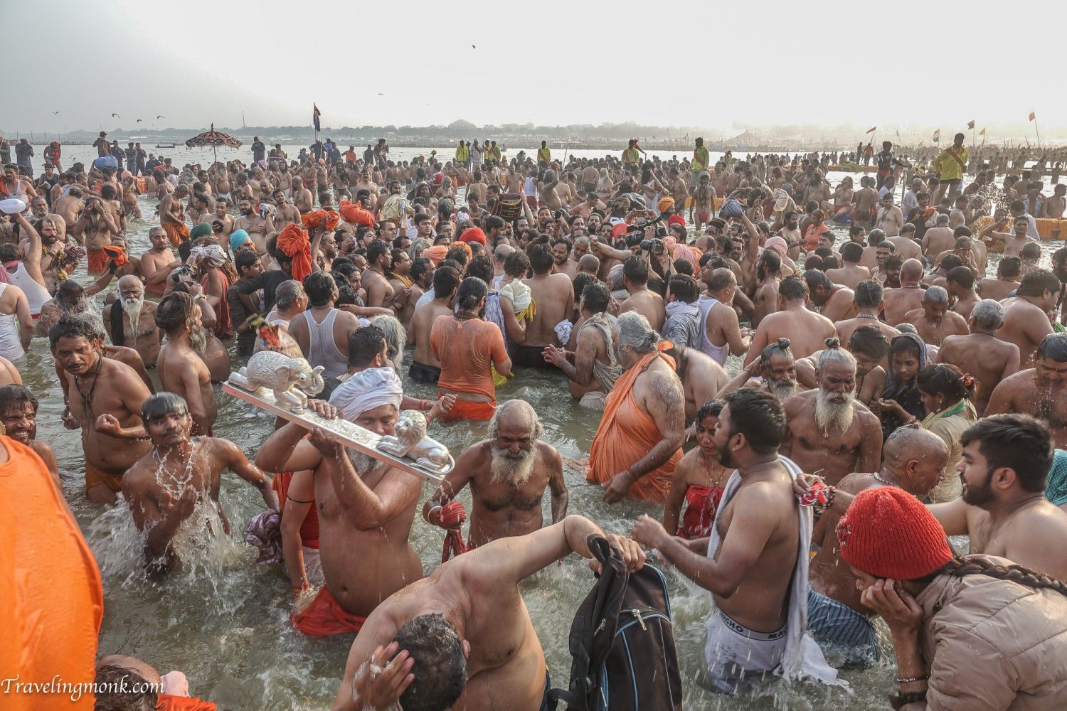 Мы наконец достигли места слияния несколько часов спустя. Ганга кипела, когда одни люди пытались двинуться к воде, в то время как другие пытались вернуться после купания.