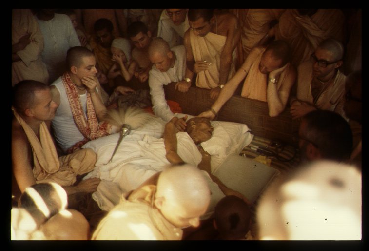 Бхакти Бхринга Говинда Свами: В это время я находился очень близко у лица Шрилы Прабхупады и постоянно смотрел на него. Я заметил, как движутся его губы. В какой-то момент его челюсть опустилась и его губы открылись. В ту самую секунду, когда Прабхупада произнес «Харе Кришна», я увидел, что цвет его тела изменился. Я сразу понял: «Мой духовный учитель оставил тело».