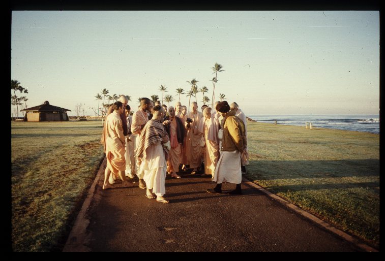 Сегодня праздник — день явления Господа Нрисимхадевы, поэтому все постятся до захода Солнца. Прабхупада принял немного экадашного прасада, а вечером вкусил обильный ужин. Я задал ему вопрос, действительно ли Господь Нрисимха явился именно на нашей планете, на что Прабхупада ответил, что не уверен, так как тиртхи в Симхачалам, которые обычно связывают с его явлением, не были признаны авторитетными преданными.