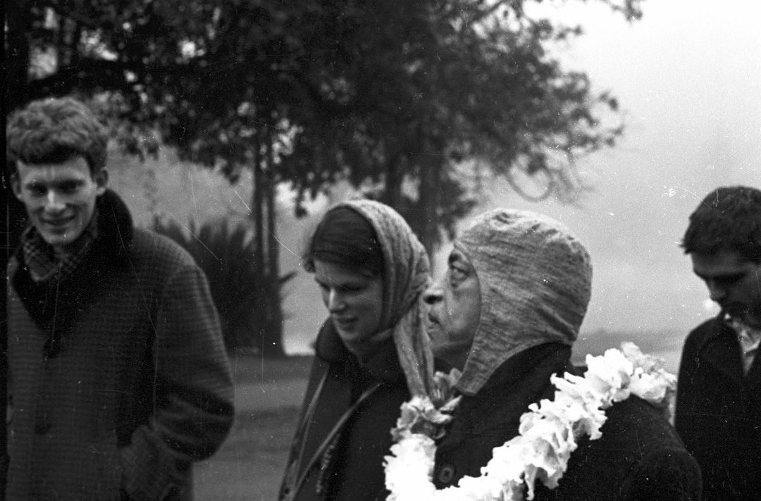 На фото: Прабхупада гуляет по берегу моря. Слева на фото Мукунда дас