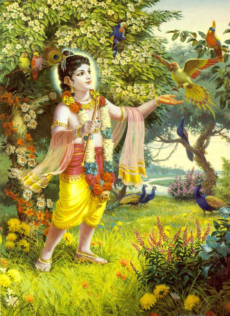 Кришна с птицамиКришна возразил: “Индра, как и другие полубоги, наслаждается жизнью на Сваргалоке по своей хорошей прошлой карме. Как только она истощится, он тут же родится среди людей на этой планете. Он сам порабощён и не может даровать освобождение из плена материального мира. Даже Господь Брахма связан кармой, что уж говорить о тех, кто работает ради вознаграждения. Мудрые, отказавшись от плодов своих благочестивых поступков, ищут покровительства Всевышнего Господа и поклоняются Ему со всем старанием. Только так можно достичь окончательного освобождения. Коровы, святые, полубоги и религиозные принципы — всё это частичные проявления Всевышнего Господа Хари. Те, кто вместо полубогов поклоняется Господу Хари, достигают счастья и в этой и в следующей жизни. Холм Говардхана — царь всех повелителей гор. Он родился прямо из груди Господа. Просто созерцая Говардхану, человек освобождается от необходимости рождаться вновь. Поэтому лучше всего устроить поклонение холму Говардхане и коровам”.